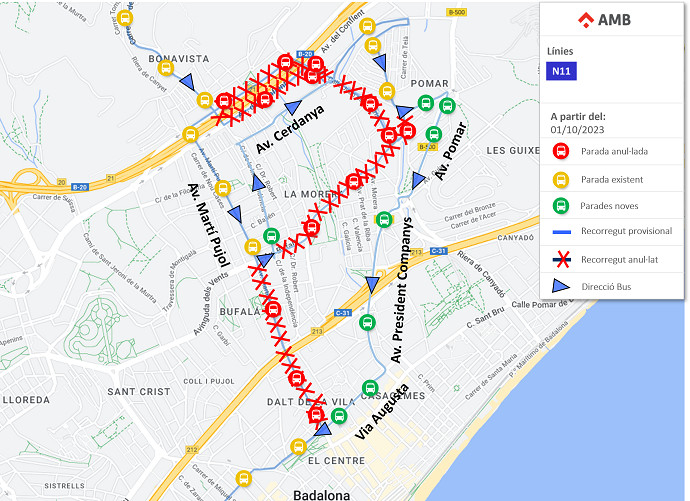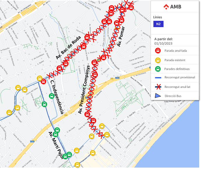 También, la N2 dejará de cubrir la zona de Pomar y la Avinguda Bac de Roda. Ahora, Pasará por la Avinguda Martí Pujol y el Carrer Independència en sentido L’Hospitalet. Fuente AMB.