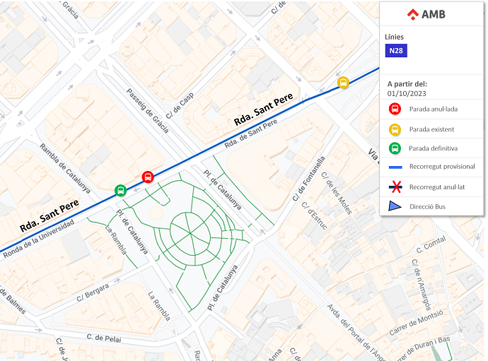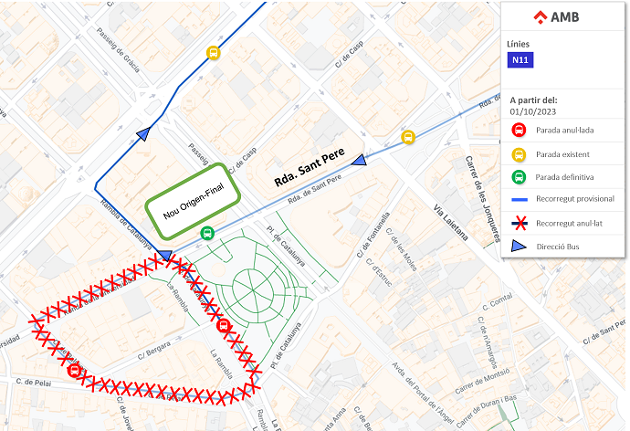 La línea N11, cambia el origen y final de Plaça Catalunya para hacerlo enfrente de la tienda Apple. Fuente AMB.