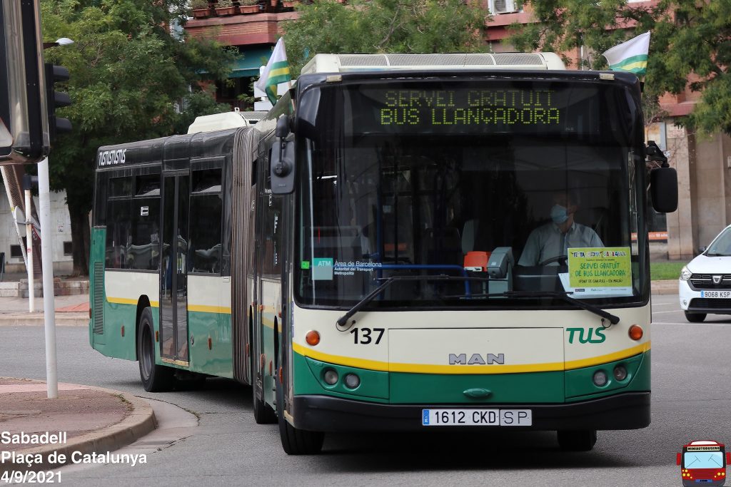 Respecto al material usado, TUS Sabadell ha asignado a este servicio gratuito, el 137. Un MAN NG313F Burillo Luxor articulado y que se usan en ocasiones muy concretas por parte de la cooperativa.
