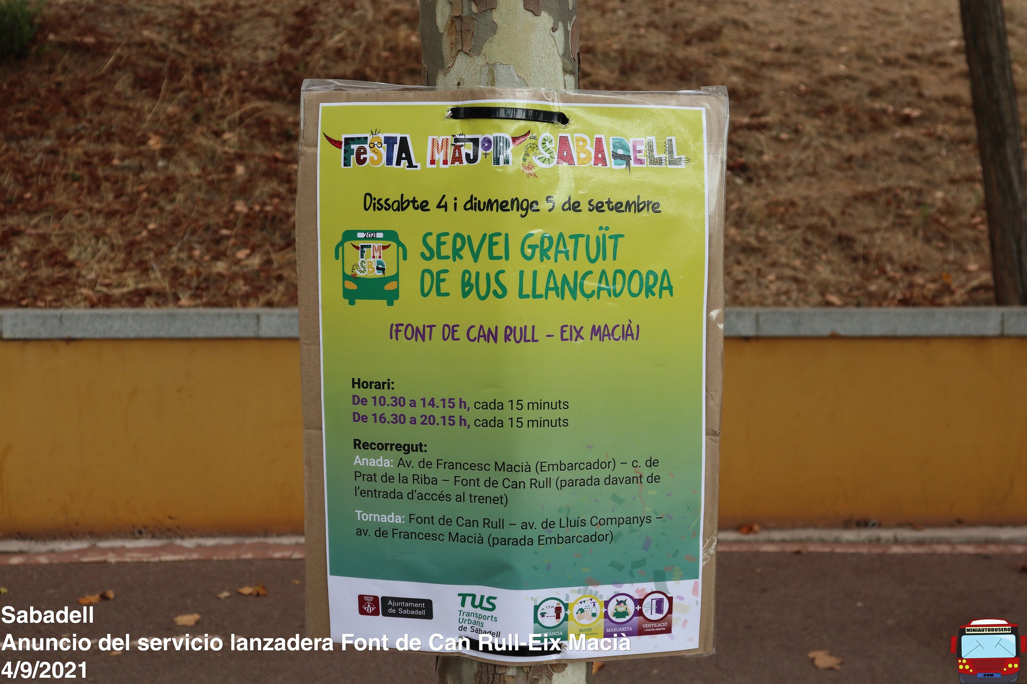 Con motivo de las fiestas mayores de Sabadell, el Ayuntamiento de Sabadell y TUS Sabadell, han instaurado una nueva lanzadera que solo presta servicio los días 4 y 5 de septiembre de 10:30 a 14:15 y de 16:30 a 20:15 a frecuencia de 15 minutos.