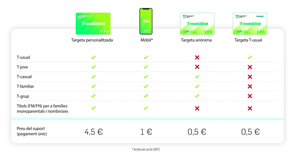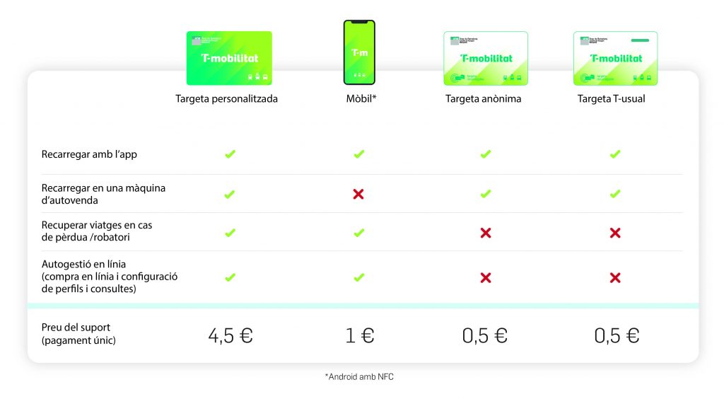La nueva tarjeta anónima de T-Mobilitat, permitirá recargar una T-Casual, T-Familiar o T-Grup. También, existe la posibilidad de tener una T-Usual pero identificada con un DNI y sin derecho a recuperar el título en caso de robo o perdida.