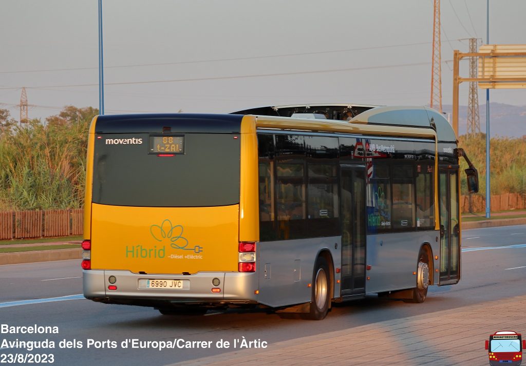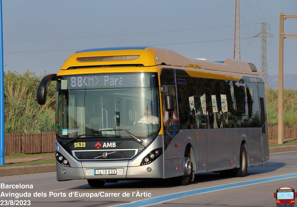 También, el grupo Moventis ha incorporado dos Volvo 7900 Hybrid con las calcas 5633 y 5636 y que han sido vinilados con los colores del consorcio AMB. La unidad de la foto, se estrenó en TCC en el 2019 y en el año 2021, fue cedido a Sarbus para sus servicios en el Vallès Occidental. Más adelante, circuló conservando el color azul en Pays de Grasse hasta medidados de 2023 donde ya regresó a TCC. Lo vemos realizando la línea 88 en dirección a Paral·lel.
