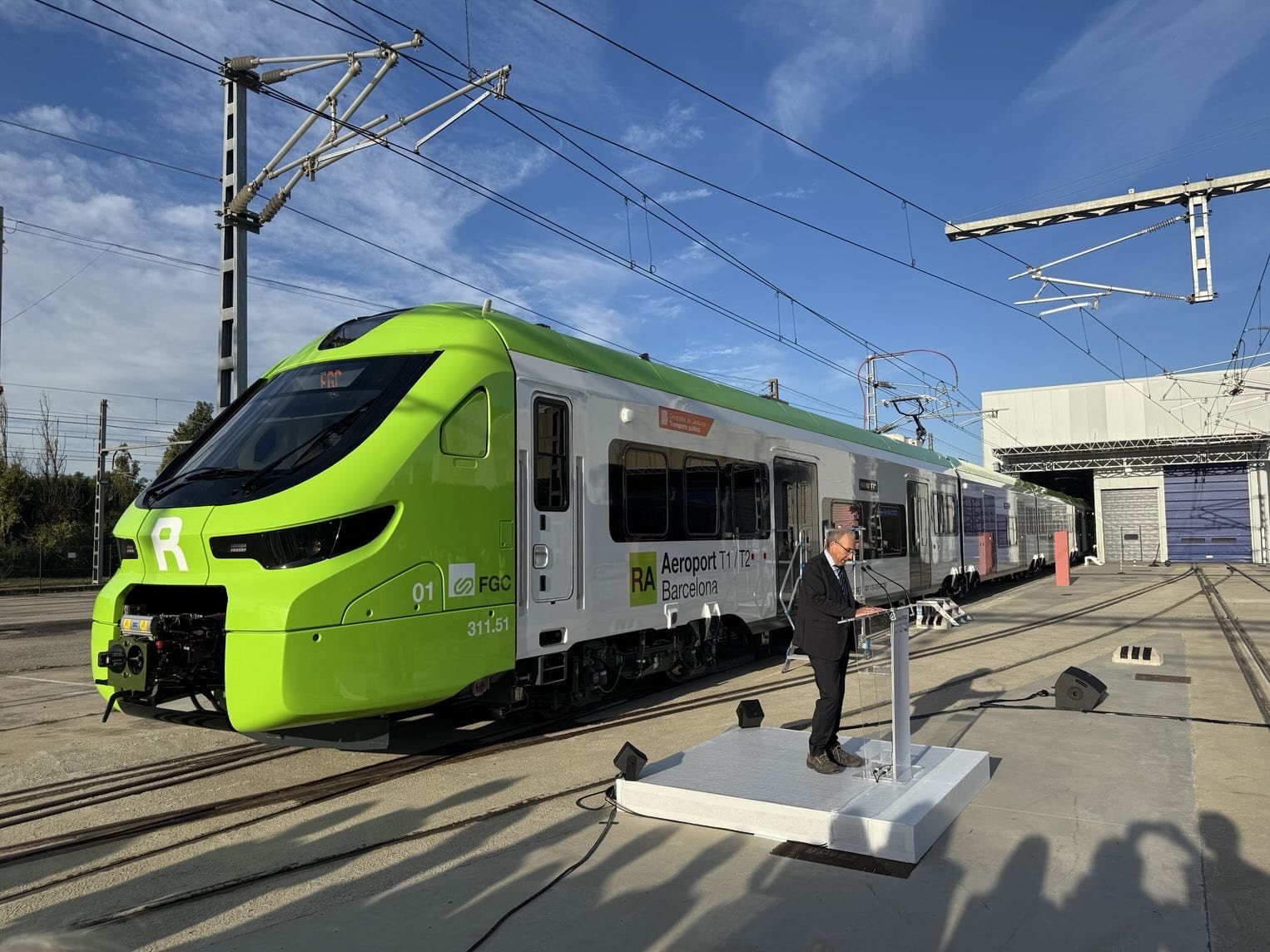 Los ferrocarriles de la Generalitat de Catalunya y Alstom, han presentado el primer convoy ya terminado de la nueva línea lanzadera R-Aeroport que se comprometen a conectar ambas terminales del Aeropuerto del Prat con la estación de Sants en algo más de 15 minutos.