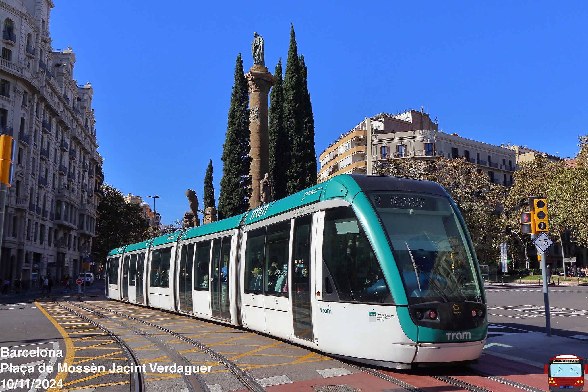 Unos metros más adelante, se encuentra su última parada de este nuevo trayecto a las que inicialmente, en el año 2025, se prevé licitar las obras para conectarlas con el Trambaix en Francesc Macià y tenerlo totalmente unido antes de 2027. Vemos la rama 13 atravesando la Plaça Mossèn Jacint Verdaguer.