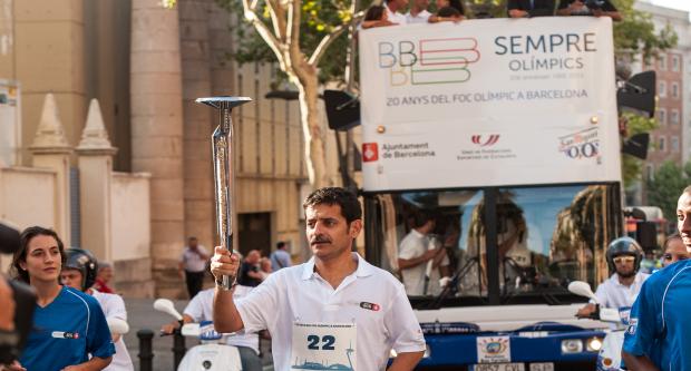 En la foto el Periodista Xavier bonastre llevando la antorcha olimpica y el 2130 al fondo.