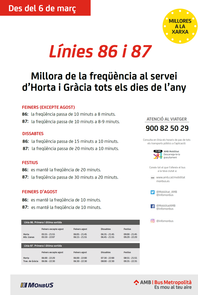 La línea 87, adelanta sus primeras salidas desde Travessera de Gràcia y la última, se adelanta unos 10 minutos durante los días laborales. Las frecuencias de paso de los días laborales exceptuando agosto, también reciben mejoras. Pasará a circular de 10 minutos a los 8-9 minutos, sábados de los 20 a 10 minutos y los domingos y festivos, de los 30 a los 20 minutos.