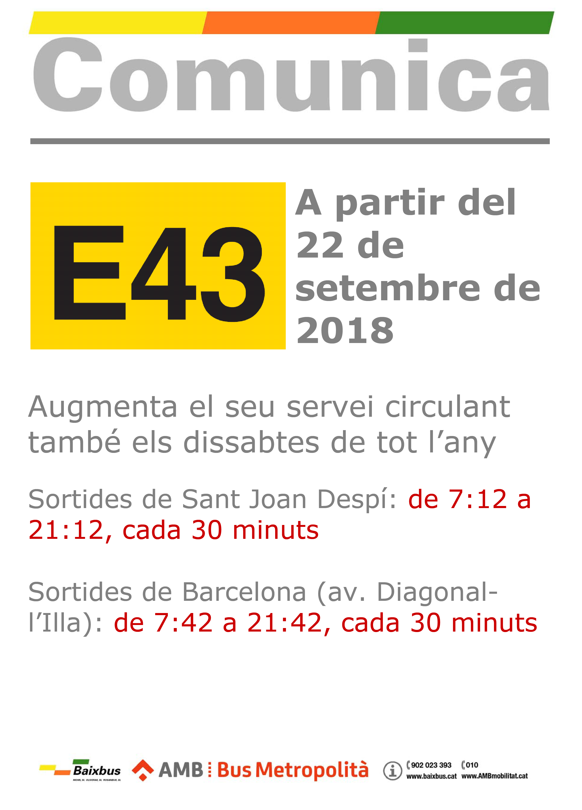 La línea E43, que une de manera directa Barcelona (Illa Diagonal) con Sant Joan Despí, ha pasado a ser la primera línea de la red AMB exprés en tener servicio los sabados no festivos.