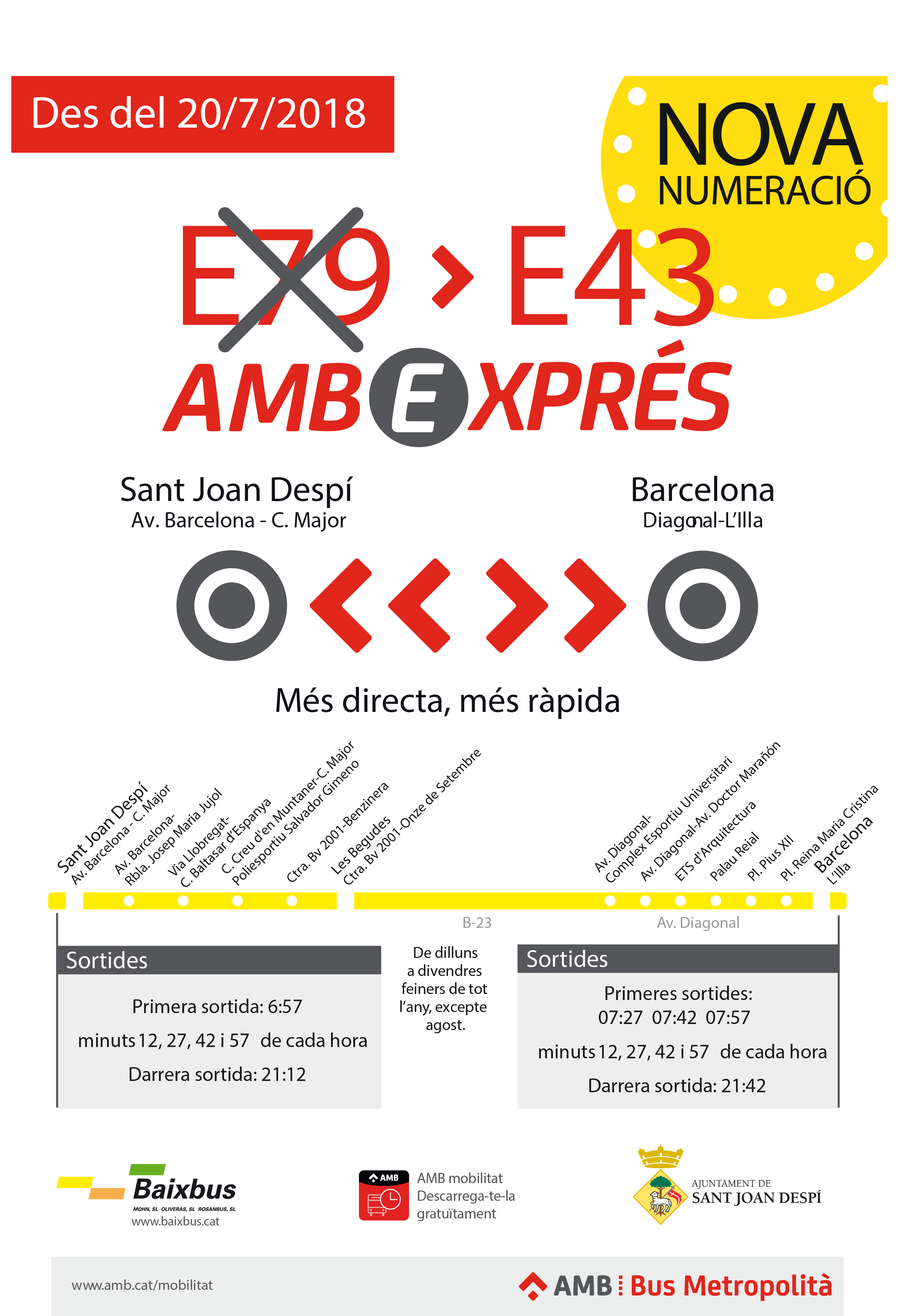 LA línea E79 (Barcelona-Sant Joan Despí) directo por autopista, pasa a llamarse E43, manteniendo horarios y frecuencias de paso de 12 minutos de 7:00 a 21:00.