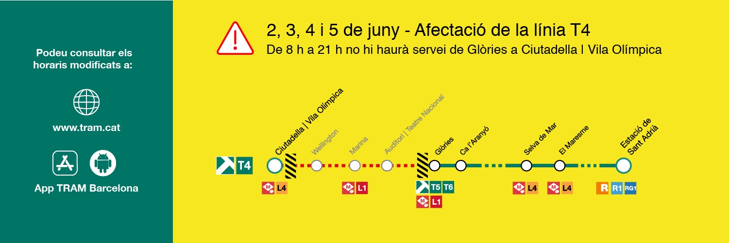 Durante los días 2 a 5 de junio y de 8:00 a 21:00, la línea T4 del Trambesós, no prestará servicio entre Glòries y Ciutadella Vila Olimpica por poda de arboles en la calle Wellington que se realiza periódicamente el Ayuntamiento de Barcelona.
