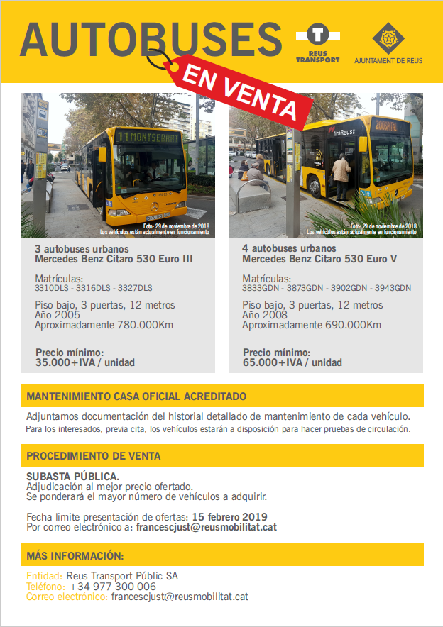 La empresa gestora de los servicios urbanos de Reus, ha puesto en venta toda su flota compuesta por Mercedes Citaro de diferentes épocas sin entrar al C2.