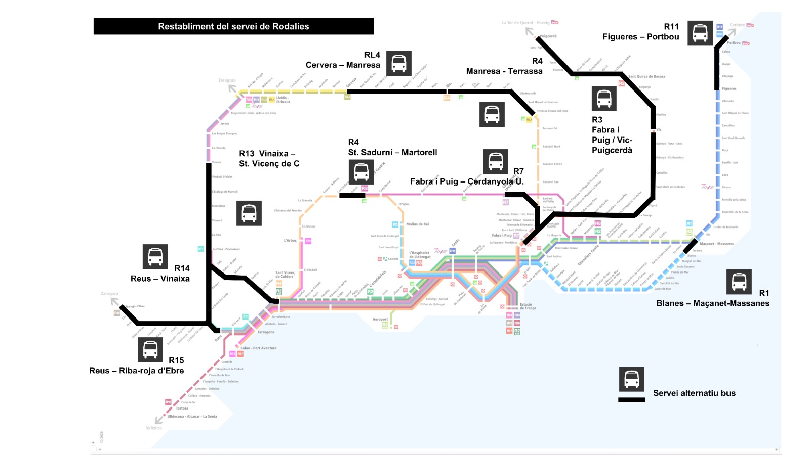 - R4. Solo funcionará entre Sant Vicenç de Calders y Sant Sadurní d’Anoia y entre Martorell y Terrassa. Los tramos de Sant Sadurní hasta Martorell y entre Terrassa y Manresa se realizarán en autobús.