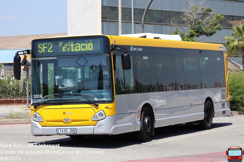 Recientemente, se han repintado también los Heuliez más viejos adscritos a la AMB. En esta foto, el SF8, ahora renumerado como 2016 luciendo su nuevo aspecto en la línea SF2.