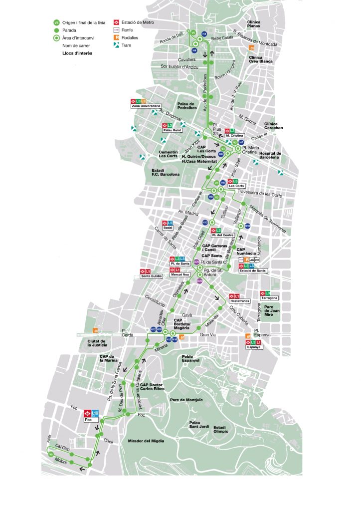La línea comenzará a bajar por el Passeig de la Zona Franca para conectarla con la L10 del metro hasta bajar al Carrer Motors donde tendrá su final de línea en el final de dicha calle incluyendo una parada en el Institut Mare de deu de la Merçè. En sentido Pedralbes, irá por Cal Cisó, volverá a subir por el Passeig de la Zona Franca hasta Foc y recuperará su recorrido original.