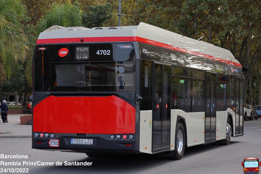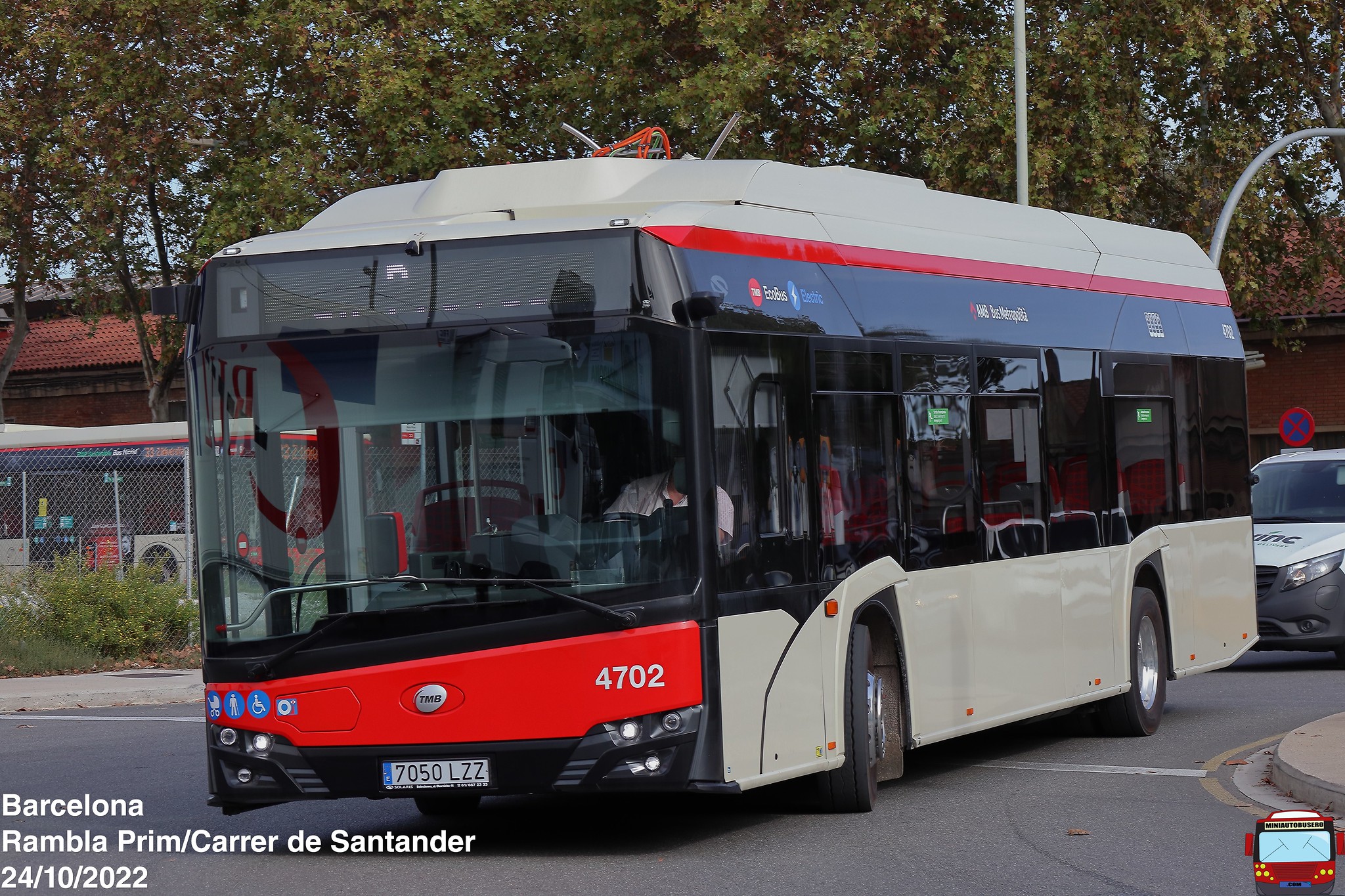 Los nuevos Solaris Urbino 12 electric, van simulando las líneas 11 y V31 en la franja de la mañana. Vemos el bus 4702 simulando la línea V31 a su paso por el principio de la Rambla Prim.