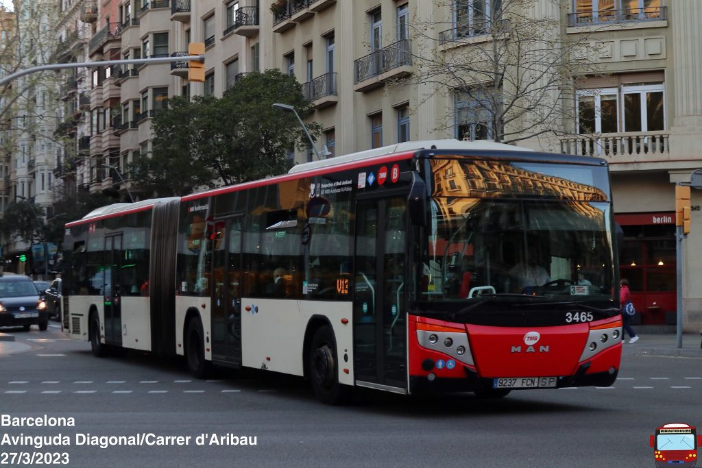 El 3034 estará de reserva en la cochera de Triangle. Lo vemos realizando un servicio de la línea 33 a la altura de la Casa de les Punxes.El coche 3465, irá asignado a la línea V13. Lo vemos cubriendo el turno 3 en dirección a Pla de Palau.