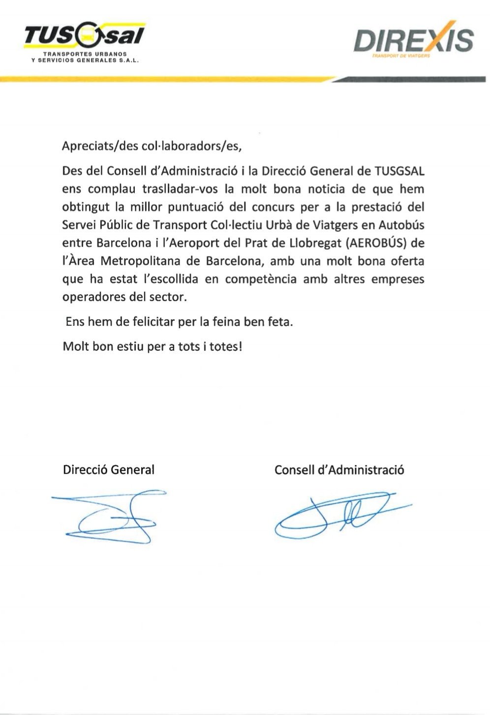 En un comunicado, daban las gracias por ganar la concesión por parte del consejo de administración y también, por mantener un jugoso servicio que mueve muchos millones a Barcelona y a la AMB.