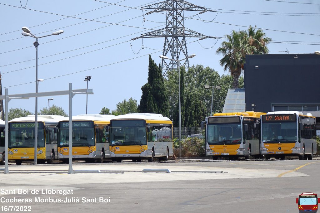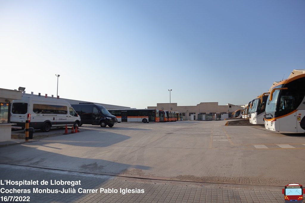 Hasta que no llegue la nueva flota, Monbus ha incorporado numerosos coches de otros servicios de España. Se han incorporado cinco Mercedes Citaro Facelift de tres puertas que proceden principalmente, de Alcalábus y con las calcas 1540, 2050, 2402, 2404 y 2428. En esta foto, el coche 2428 realizando la línea L78.También, Monbus ha adquirido del mercado de segunda mano europeo, varios Mercedes Citaro Facelift LE de dos y tres puertas respectivamente. Proceden de la empresa noruega Norgesbuss y han venido mediante el compra venta italiano Basco Bus. Vemos el coche 3449 donde en su primer día, han ido asignados a las líneas exprés E43 y E79.También, procedentes de Alcalábus, se han enviado a Barcelona los 2390, 2392 y 2394. Tres Mercedes CItaro C2. Vemos el coche 2392 en la línea L77. Donde Monbus, también aplica los origenes y destino como ya se hace en otras concesiones como la de Tusgsal o Avanza Baix.De Murcia, se ha cedido dos Isuzu Citiport 12 a los que ya hay tres en servicio desde Junio para AENA y para las líneas 88 y PR4. Unos meses antes, ya habían algunas unidades pendientes de estrenarse y que han ido a líneas como la L52, L70, L72 y L78. Vemos la unidad 3458 a cargo de un servicio en la línea L72.También de tierras murcianas, han llegado tres Volvo B8R Castrosua Magnus.E. Estos proceden de LAT y ostentaban las calcas 322, 323 y 324. Monbus los ha asignado a las líneas L70, L72 y L77. Vemos la unidad 3773 en la línea L72. Saludos al conductor.Sus cocheras están repartidas por la comarca del Baix Llobregat. La primera cochera es la de Julià en Hospitalet de Llobregat, donde se ha adquirido unos terrenos en la otra acera para aparcar vehículos de Monbus y Julià.La segunda cochera, es la de Calle Rafael Barradas en L’Hospitalet de Llobregat. En esta foto, una foto tomada desde la vía pública de la cochera de Sant Boi. Ubicada en Avinguda de La Marina.La Flota subrogada a Monbus-Julià, han sido los Man Castrosua City Versus, Man Tata Hispano Intea LE, Algunos Irisbus Crossway LE, los Man Castrosua Magnus más modernos, el único Iveco Urbanway, tres Irisbus Citelis 12, dos de ellos con carrocería Castrosua City Versus, los Vectia Teris.10 y todos los Heuliezbus. En esta foto el 3521, anteriormente 2254, realizando la línea L76. También, se han subrogado los Solaris Urbino 12 Hybrid recientemente incorporados. Vemos la unidad 3555 a cargo de un servicio en la línea SB1. En Oliveras, era el 2288.
